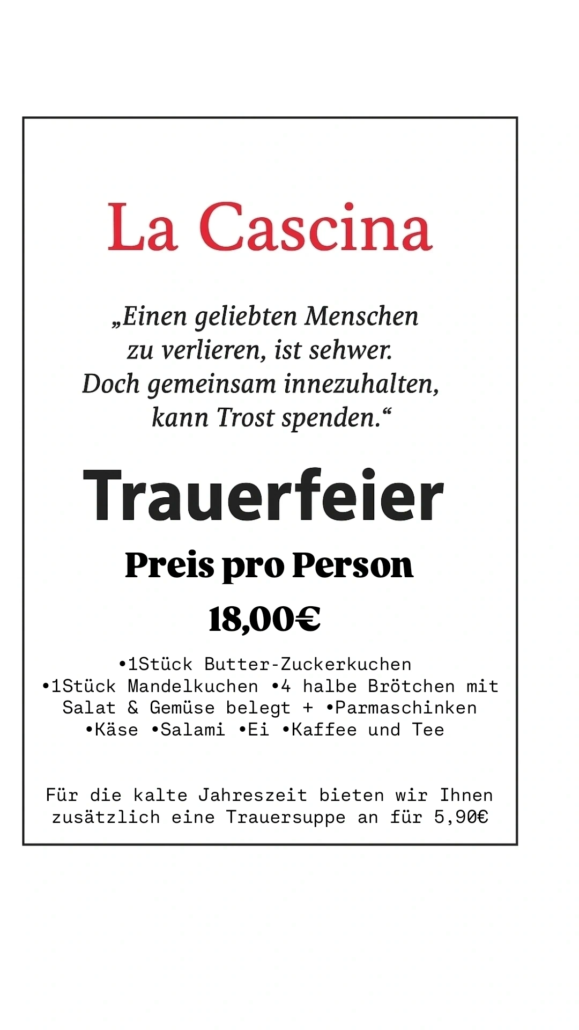 Ab 8 Personen oder bei Abholung öffnen wir auch außerhalb der regulären Zeiten. Bitte vorab per E-Mail oder Telefon melden.