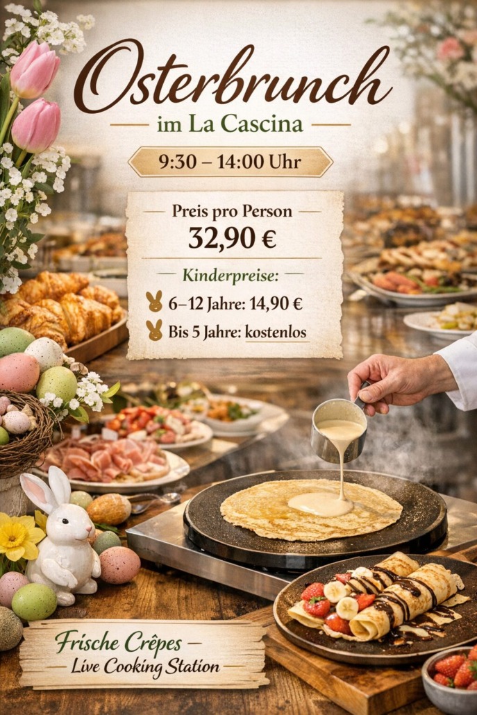 von frischen Brötchen, Croissants, Aufschnitt und Käse über warme Gerichte bis hin zu süßen Highlights – und natürlich unsere frischen Crêpes von der Live‑Cooking‑Station.🐣Preis pro Person: 32,90 €